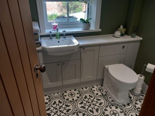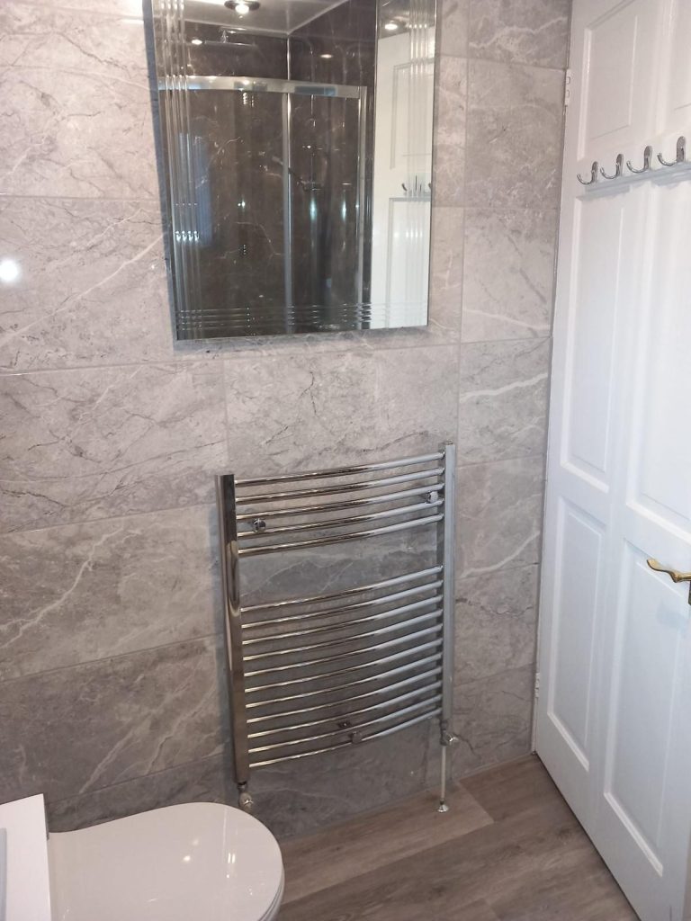 A quadrant shower enclosure with a modern chrome frame and rainfall shower system was installed, complemented by a matching chrome towel radiator. The new vanity basin unit and close-coupled WC feature clean, minimalist lines, maximising functionality within a compact layout.