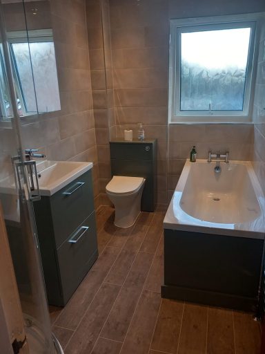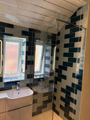 A chrome heated towel radiator offers both function and a modern aesthetic, complementing the other polished fittings throughout the space. The full-sized bathtub includes a glass screen and sleek white panelling for a crisp, clean finish.
