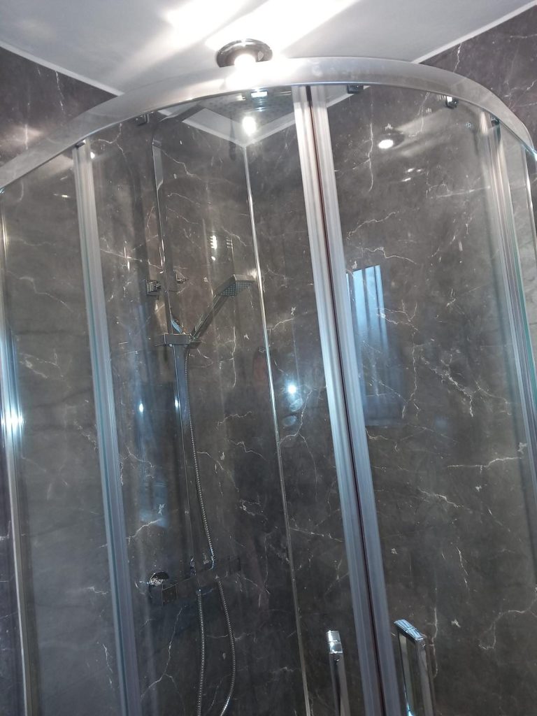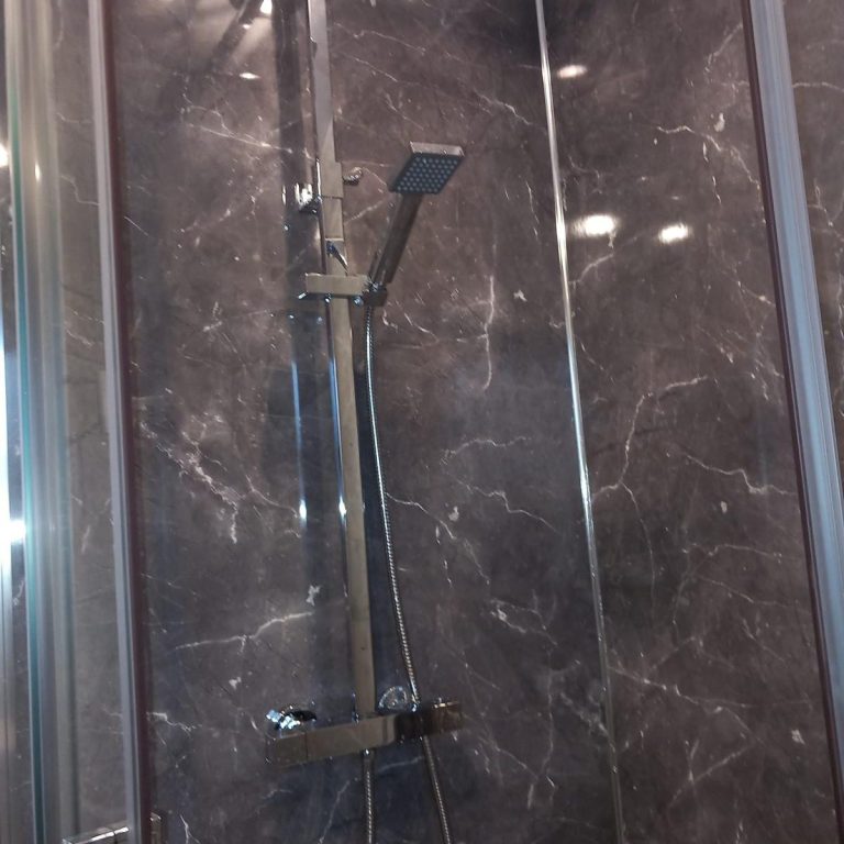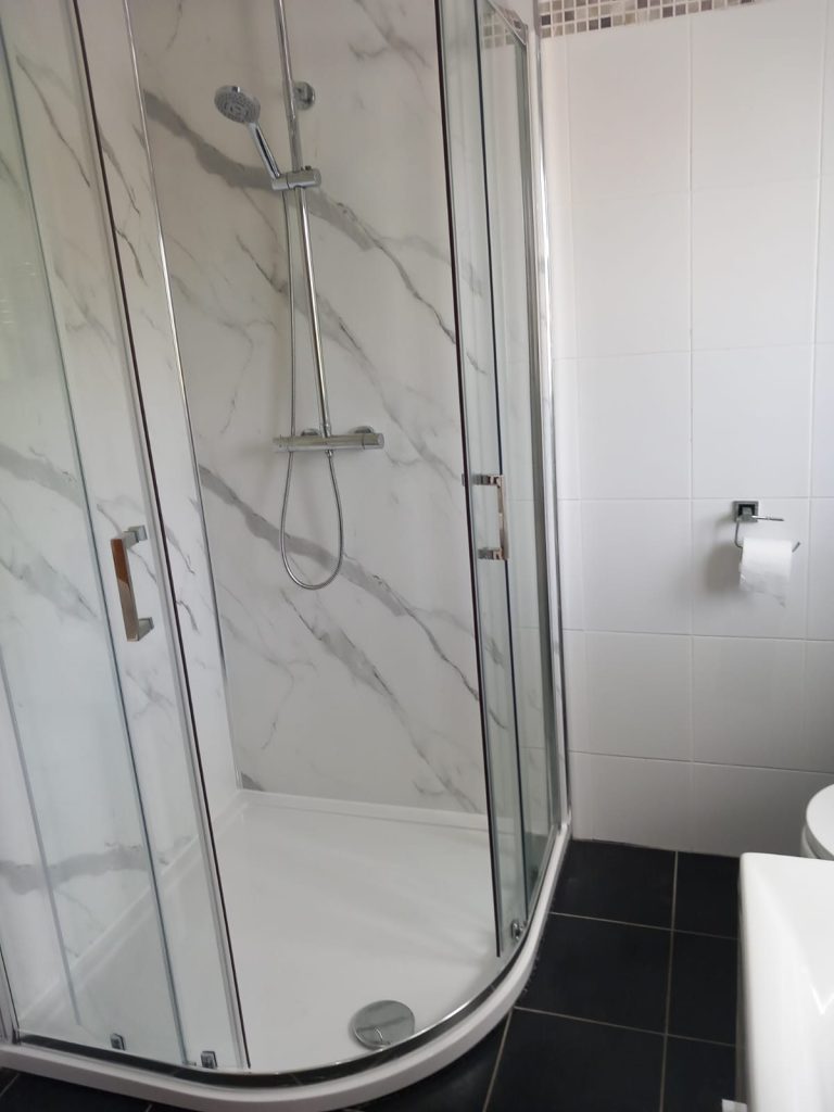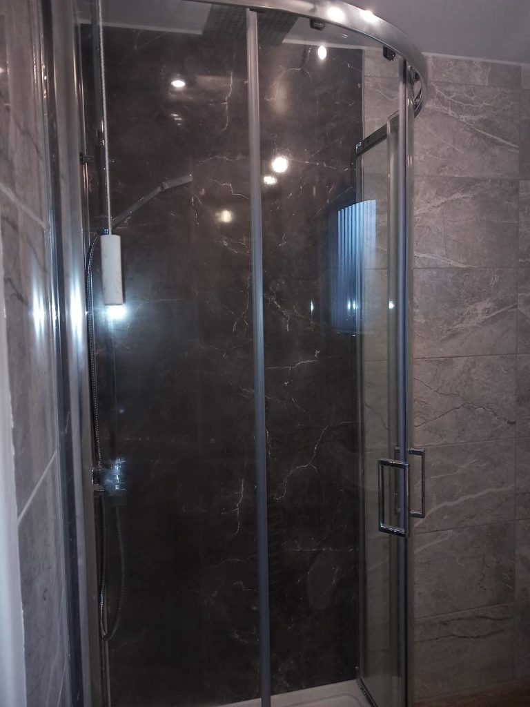 After assessing the condition of the walls, we carried out a full replacement, installing a high-quality marble-effect wall panel system. This option was chosen by the customer to provide a seamless, waterproof, and low-maintenance surface that enhances both durability and ease of cleaning.