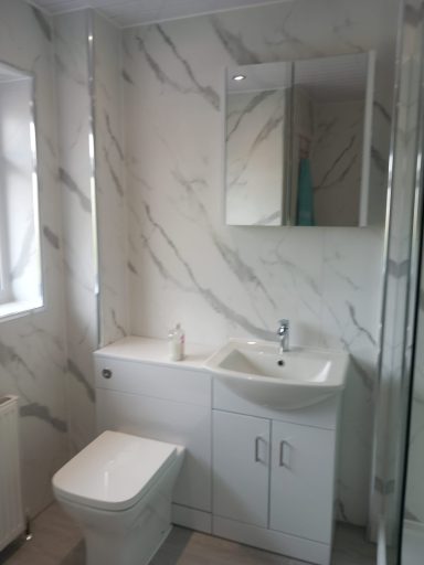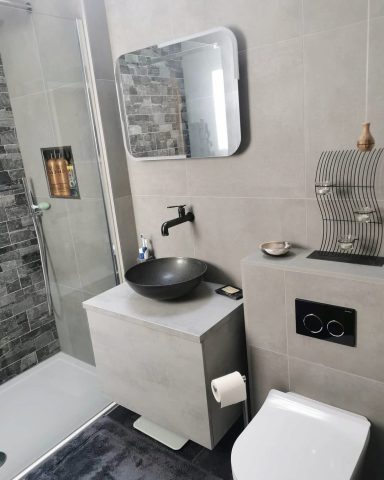 This bathroom underwent a full renovation to create a sleek and contemporary space with a focus on luxury and easy maintenance. The existing fittings were removed, and the room was fully refurbished with marble-effect wall panels in contrasting tones to define the shower area and main walls. These panels provide a seamless, waterproof, and low-maintenance surface, giving the room a high-end feel while ensuring long-term durability.