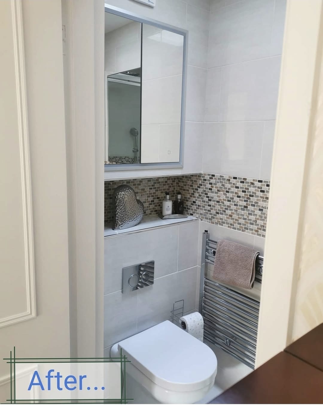 A quadrant shower enclosure with a modern chrome frame and rainfall shower system was installed, complemented by a matching chrome towel radiator. The new vanity basin unit and close-coupled WC feature clean, minimalist lines, maximising functionality within a compact layout.