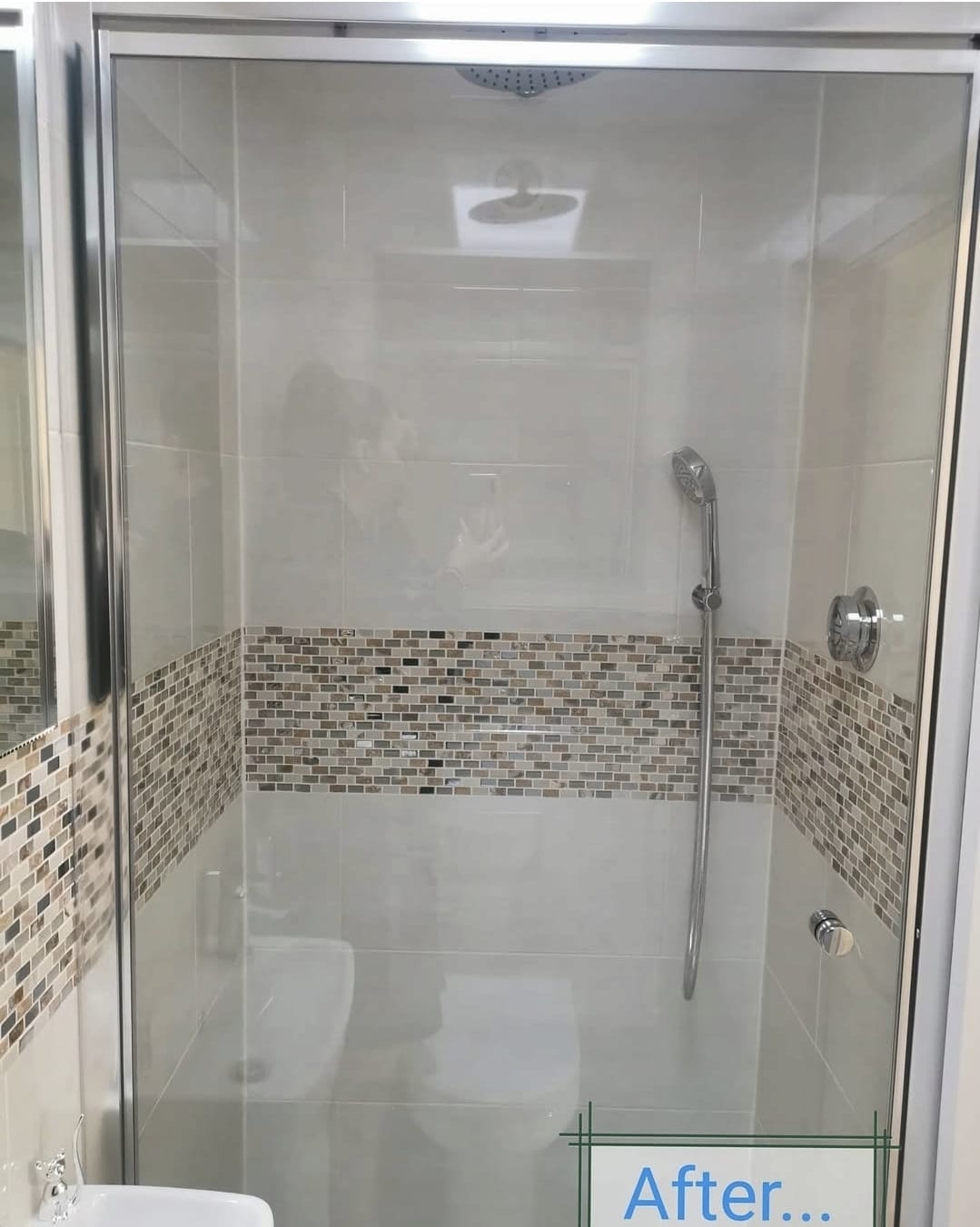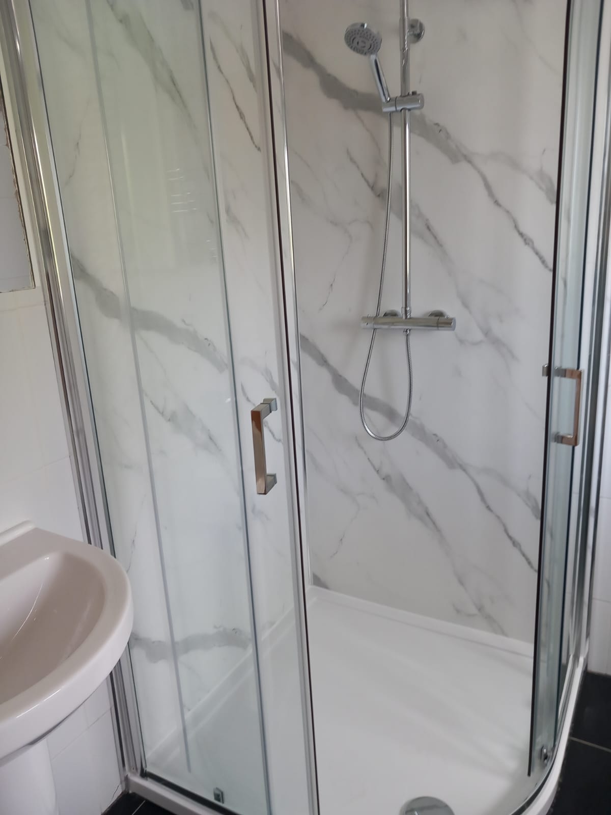After assessing the condition of the walls, we carried out a full replacement, installing a high-quality marble-effect wall panel system. This option was chosen by the customer to provide a seamless, waterproof, and low-maintenance surface that enhances both durability and ease of cleaning.