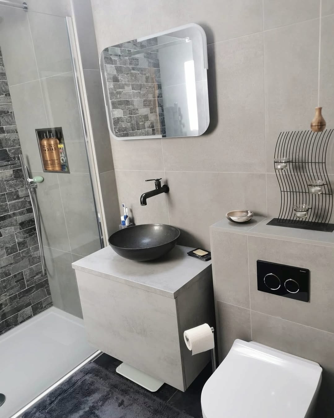 This bathroom blends functionality and design seamlessly — bright, easy to maintain, and perfect for everyday comfort in a compact space.