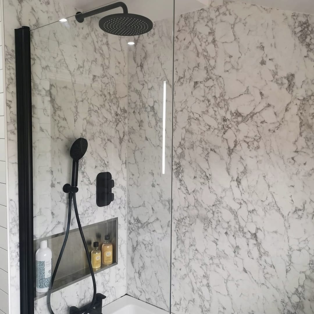 This bathroom underwent a full renovation to create a sleek and contemporary space with a focus on luxury and easy maintenance. The existing fittings were removed, and the room was fully refurbished with marble-effect wall panels in contrasting tones to define the shower area and main walls. These panels provide a seamless, waterproof, and low-maintenance surface, giving the room a high-end feel while ensuring long-term durability.